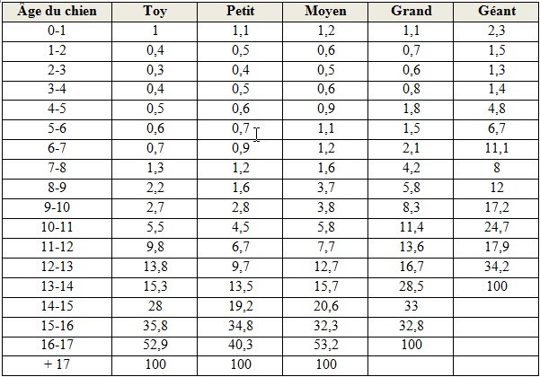 Contrairement à ce que l’on croit, il ne suffit pas de multiplier par 7 l’âge du chien pour obtenir son âge « humain » car il n’ a pas de relation linéaire entre les deux. En revanche, on peut utiliser le tableau suivant.