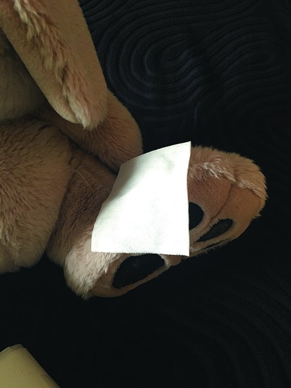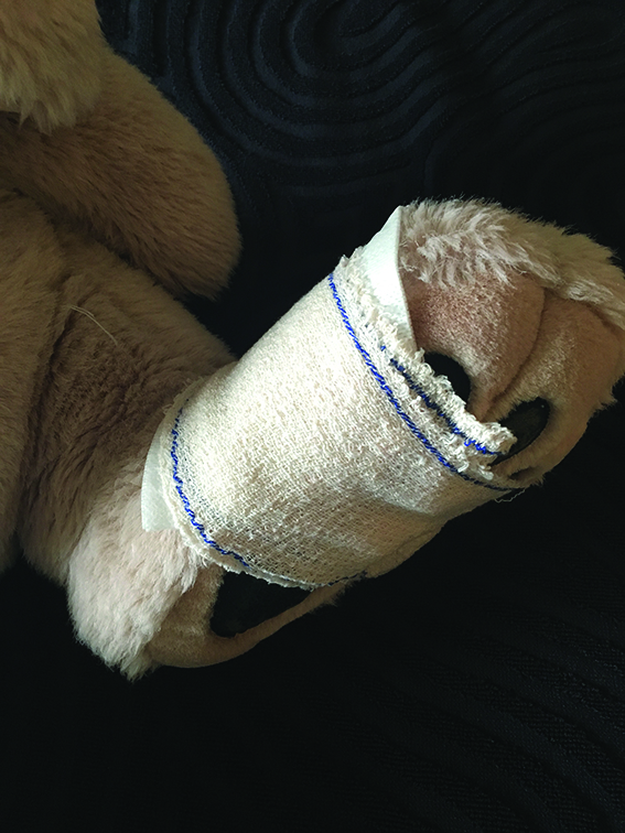 • sur les membres, il est possible d’utiliser de vieilles chaussettes pour protéger les pansements, éventuellement maintenues par une bande de sparadrap ;