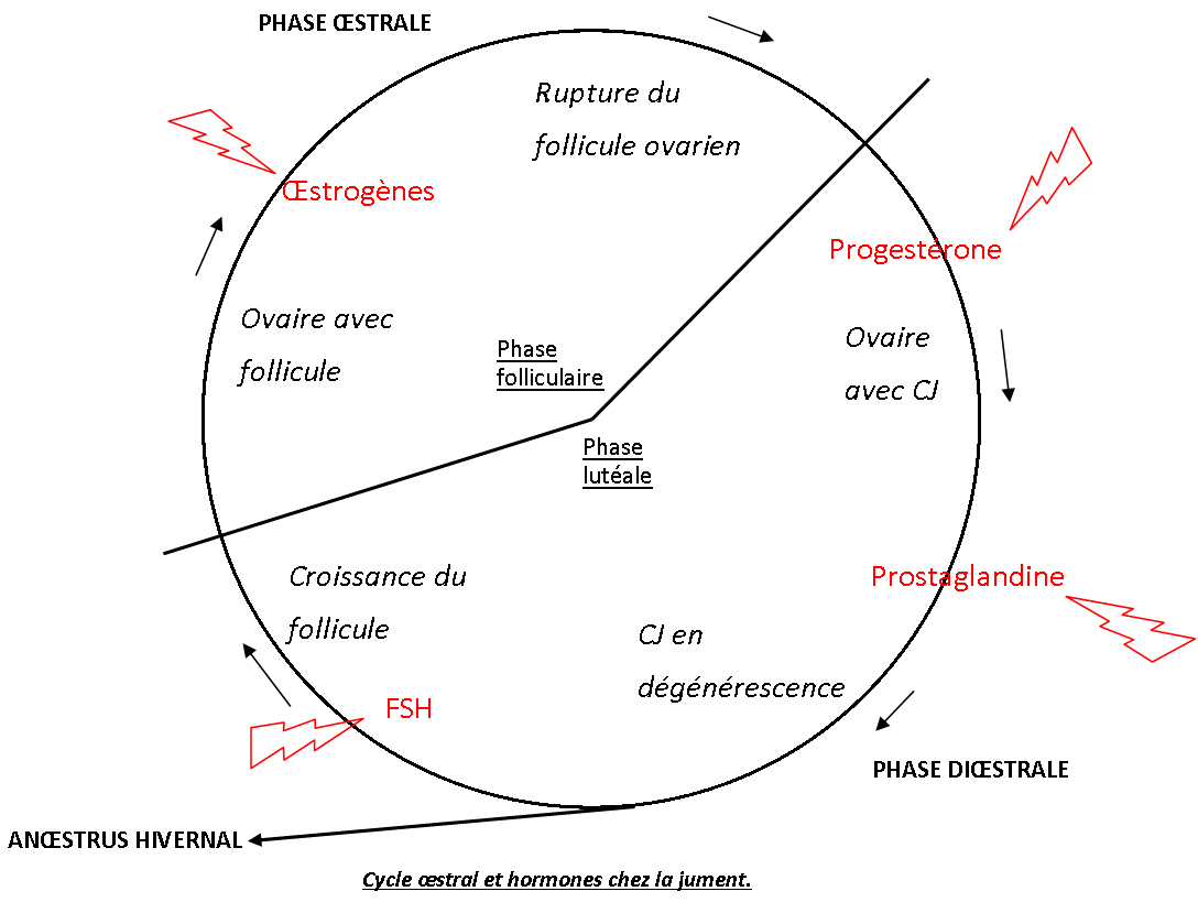 L’hypothalamus reconnaît la durée de la nuit par l’intermédiaire de la mélatonine, hormone sécrétée pendant la nuit par la glande pinéale (ou épiphyse) située dans le cerveau. Lorsque les jours rallongent, la quantité de mélanine reçue décroît, entraînant la sécrétion par l’hypothalamus de GnRH. Sous l’influence de la GnRH, l’hypophyse sécrète deux hormones (gonadotrophines) : la FSH qui stimule la croissance folliculaire et la LH qui stimule l’ovulation. De son côté, l’ovaire sécrète également deux hormones (stéroïdes) : les œstrogènes par les follicules et la progestérone par le corps jaune. L’hypophyse interprète un taux d’œstrogènes bas en augmentant la sécrétion de FSH. Et inversement, un taux élevé d’œstrogènes en présence d’un follicule mûr (préovulatoire) déclenche la décharge ovulante de LH et arrête la sécrétion de FSH. La présence de progestérone indique ensuite à l’hypophyse la présence d’un corps jaune sur l’ovaire. La sécrétion de LH n’est donc plus nécessaire et aucun pic de LH n’est observé pendant la phase lutéale. Puis, en l’absence de gestation, l’utérus émet des décharges d’une nouvelle hormone, la prostaglandine PgF2a. Cette hormone provoque la destruction du corps jaune (« lutéolyse ») et par conséquent l’arrêt de la sécrétion de progestérone, ce qui signe le début d’une nouvelle poussée folliculaire.
